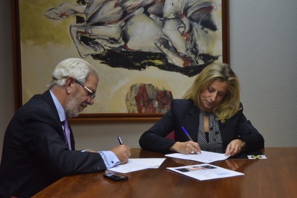Elena Jiménez de Andrade, presidenta del Colegio de Madrid, y Jesús de la Mata, director general de la Agrupación del Convenio RC Corredores, firmaron el acuerdo en la sede del colegio.
