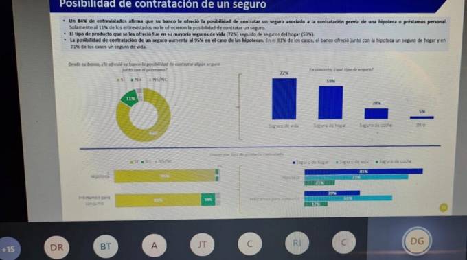 La encuesta, realizada por Gad3 entre 1.100 entrevistas a mayores de 35 años, arroja datos como que el 74% de los encuestados afirma que contrató un seguro a través del banco en el momento de formalizar una hipoteca o un préstamo. El dato asciende al 90% en el caso de hipotecas y al 6% en préstamos al consumo.