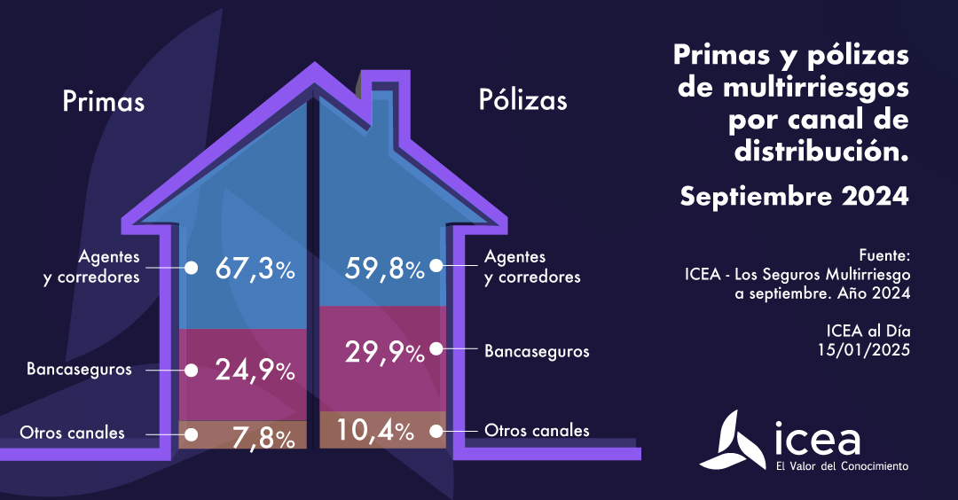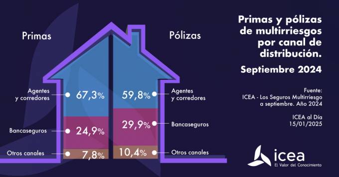 En su boletín semanal, ICEA ha ofrecido datos hasta septiembre de la distribución en Multirriesgos. En cuanto a primas, agentes y corredores siguen siendo el principal canal de distribución, intermediando el 67,3% de las primas; es decir, más de dos terceras partes del total. Detrás se encuentra la bancaseguros (24,9%) y la suma de otros canales (7,8%).