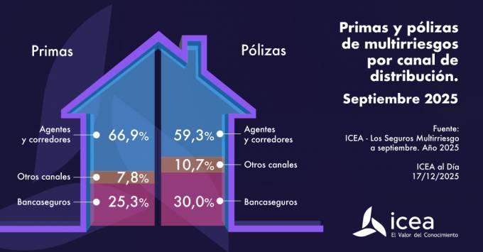 Hasta el 66,9% de las primas y el 59,3% de las pólizas de Multirriesgos al cierre del pasado mes de septiembre se distribuyeron a través de agentes y corredores, según los datos de ICEA. Se mantienen como el principal canal de distribución, seguido de lejos por el de bancaseguros, aunque este es el canal que registró mayor crecimiento al término de los nueve primeros meses del año.