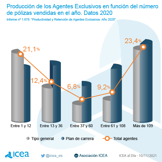En esa producción se registran importantes diferencias. El 73% de los agentes exclusivos han generado negocio de al menos una póliza anual durante 2020; mientras, en la red de agentes en planes de carrera el índice de agentes productivos es mayor y engloba el 90%. Y "para los agentes tipo general este índice de productivos es menor y alcanza el 69%", añade ICEA.