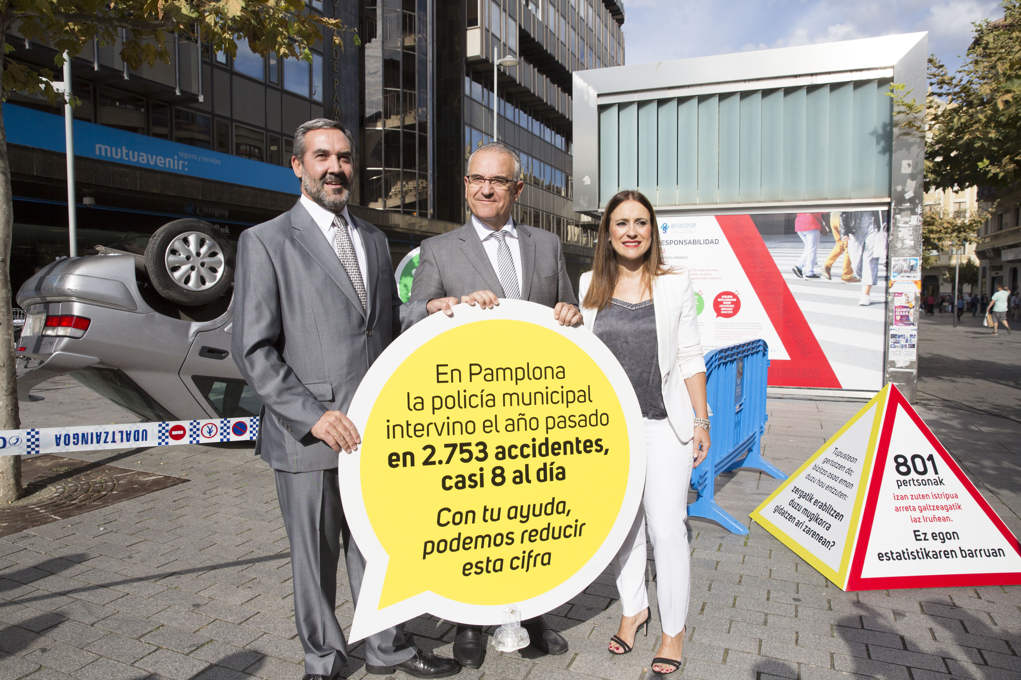 El alcalde de Pamplona, Enrique Maya, y la presidenta de Anacose, Silvia Manjón, acudieron a uno de los puntos donde se simuló de un 'vuelco por distracción'. Explicaron cómo y por qué se concibió esta campaña de seis días que quiere centrar la atención de todos en las estadísticas evitables de accidentalidad. La campaña finalizará el domingo 6 de octubre y las simulaciones se desmontarán al día siguiente.