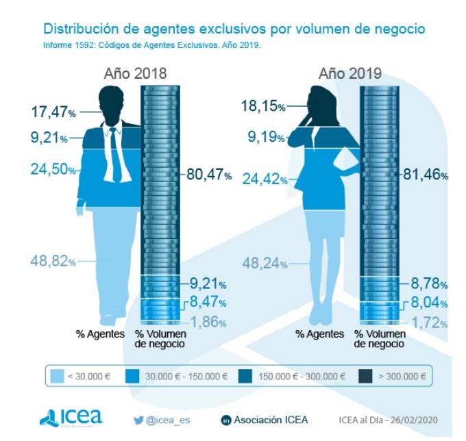 Pero no todas las noticias son negativas. Poco a poco, los agentes exclusivos están incrementando su cartera. De los 53.739 operativos en 2019, 9.753 tenían un volumen de negocio superior a 300.000 euros. Representan el 18,15% del total, casi medio punto porcentual más (0,68) que en 2018 y dos puntos por encima respecto a 2017. Este colectivo aporta al sector el 81,46% de las primas de negocio y aproximadamente 1 millón de euros por agente.