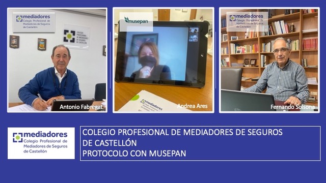 El Colegio de Mediadores de Seguros de Castellón y Musepan han prolongado su protocolo de colaboración por un año más. Lo han suscrito Antonio Fabregat, presidente de la institución colegial, y Andrea Ares, directora comercial de Musepan, en una reunión celebrada de manera telemática.