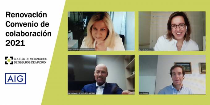 Elena Jiménez de Andrade, presidenta del Colegio de Madrid, y Benedetta Cossarini, directora general de la aseguradora, han sido las encargadas de rubricar su renovación de manera online. Han estado acompañadas por Mario Diaz-Guardamino, director de Desarrollo de Negocio Iberia de AIG, y Ángel Corada, gerente de la institución colegial.