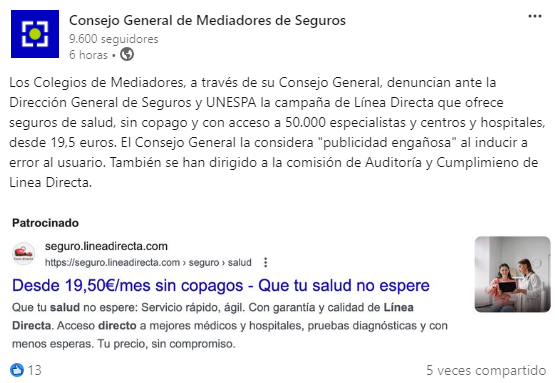 Hace una semana, el Consejo General ya mostró en sus redes sociales su enfado contra esta campaña. En LinkedIn, publicó un post en el que se leía lo siguiente: "Ofrecer pólizas de salud a 19,50 euros sin copago no es de recibo. No vale con indicar en letra pequeña 'desde' porque incita claramente al error. Es lamentable este tipo de campañas engañosas donde se pone a prueba la ingenuidad y buena fe del usuario".