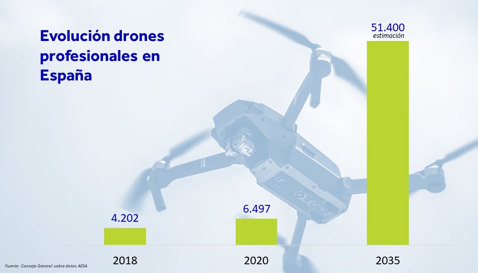A cierre de 2020, había registrados en España 6.497 drones, un 55% más que hace dos años, y las previsiones que maneja el Consejo General de los Colegios de Mediadores de Seguros apuntan a que en 2035 esta cifra superará los 51.000, contando solo los drones de uso profesional.