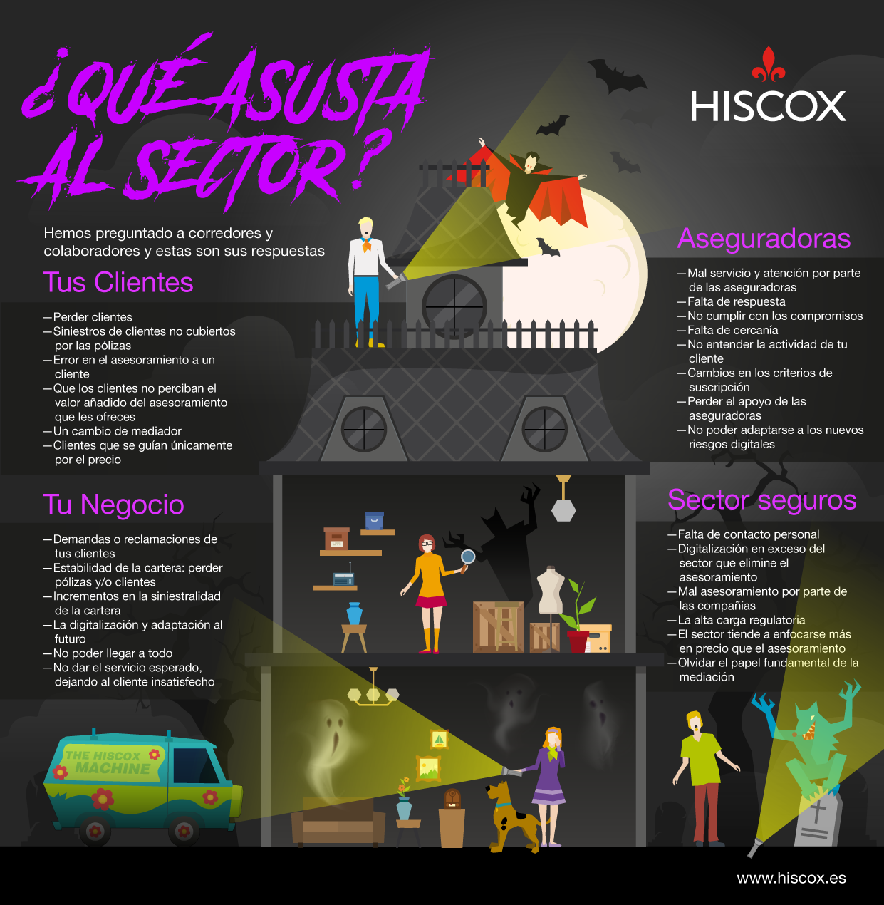 Con motivo de Halloween, Hiscox ha realizado a través de su laboratorio de innovación Hiscox Lab una consulta entre sus corredores sobre cuáles son sus mayores miedos, con cuestiones dirigidas a obtener información en relación a cuatro áreas clave para ellos: el sector en general, sus clientes, su negocio y la relación con las aseguradoras. El resultado es que el miedo a que su profesión deje de ser valorada, o incluso desaparezca, es su principal temor.