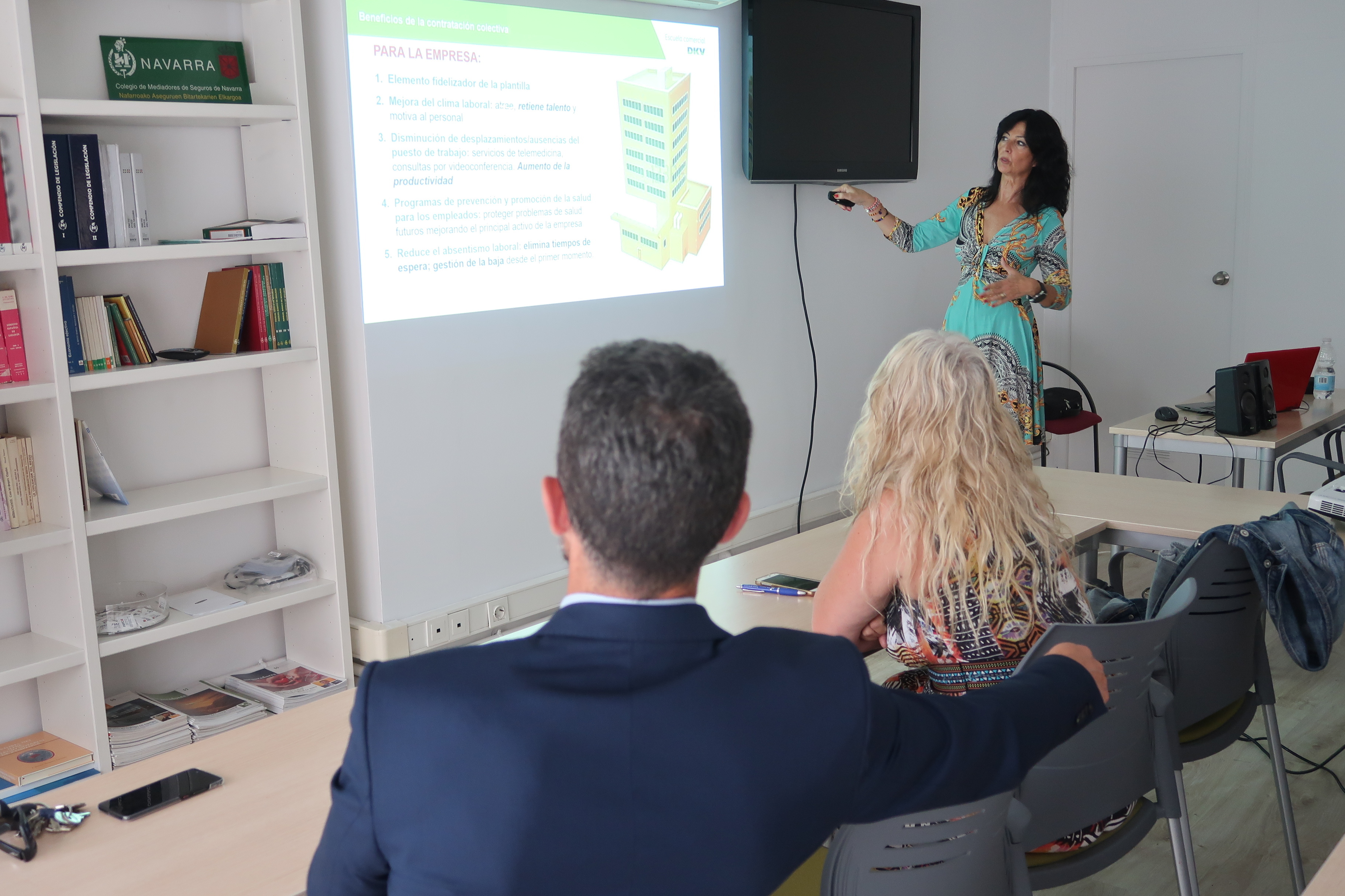 El Colegio de Navarra ha acogido una sesión de formación de DKV Seguros sobre colectivos de Salud para empresas-digital, impartida por Mercedes Giménez. "Ha cambiado el cliente, el entorno, el canal y nuestro negocio. Desde DKV hemos apostado por las redes sociales y tenemos presencia en la mayoría de ellas, como Instagram, LinkedIn, Facebook, etc." observó, y detalló las aplicaciones de la entidad que permiten ver los datos de las pólizas y realizar numerosísimas gestiones.