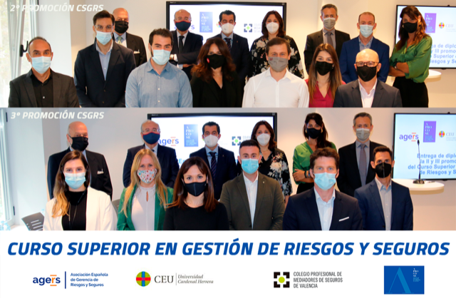 En un acto celebrado en las instalaciones del Colegio de Mediadores de Seguros de Valencia, el alumnado de las dos últimas promociones del Curso Superior en Gestión de Riesgos y Seguros ha recibido sus diplomas acreditativos por superar la formación. Este curso está impulsado por Aprocose y desarrollado e impartido por Agers en la Universidad CEU-Cardenal Herrera con el apoyo del Colegio de Valencia.