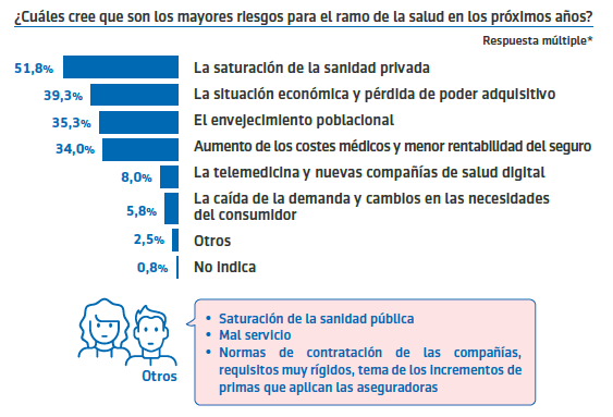 No obstante, los mediadores consultados perciben algunos riesgos que pueden perjudicar al ramo de Salud, como la saturación de la sanidad privada (así lo señala un 51,8%) y el empeoramiento de la situación económica y la pérdida de poder adquisitivo (39,3%).