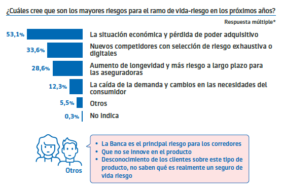 Analizando los riesgos principales que pueden afectar a este ramo, el 53,1% de los encuestados apunta al deterioro de la situación económica y a la pérdida de poder adquisitivo. Al igual que en Salud, Aegon ha querido saber los motivos por lo que algunos mediadores entrevistados no comercializan estos productos o lo hacen de forma poco habitual. Un 39,6% explica que no los comercializan por ser un nicho de mercado copado por los bancos mientras que un 23% aduce la falta de demanda debido a que la sociedad no ve necesidad de tener estos seguros.