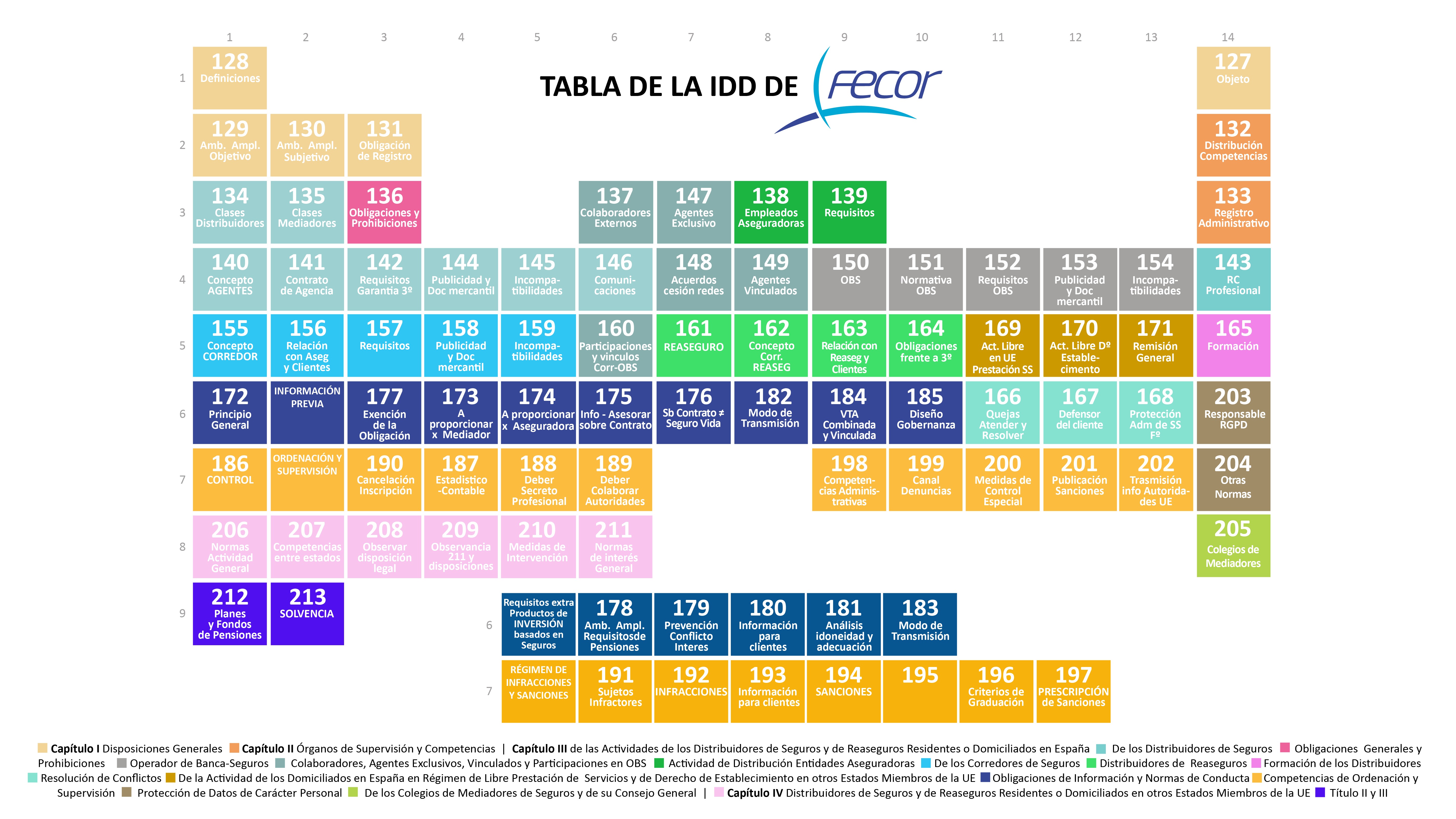 Fecor ha diseñado la 'Tabla de la IDD'. Se trata de una herramienta de consulta diseñada para facilitar el acceso y comprensión de los corredores de seguros y otros profesionales del sector sobre la nueva Directiva de Distribución de Seguros (IDD). Apunta la federación de corredores que esta tabla "recoge en una sola imagen, muy similar a la tabla periódica, toda la ley, para que de forma ágil e intuitiva se puedan realizar consultas dependiendo de los diferentes intereses de cada parte interesada".