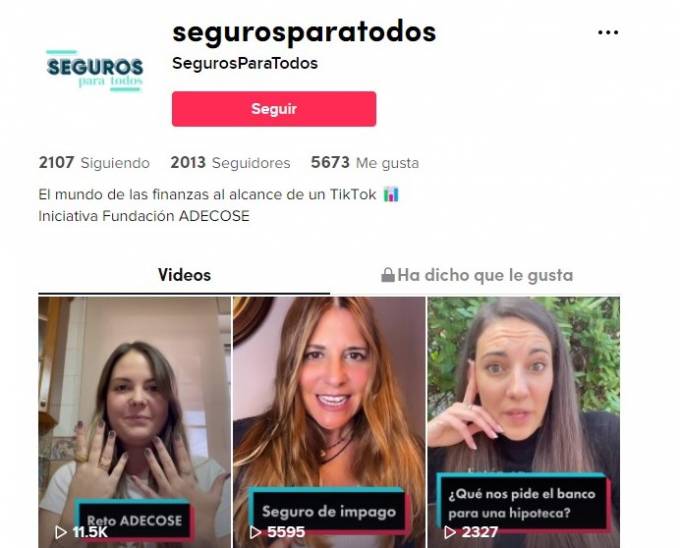 Fundación Adecose ha creado un canal en la red social Tik Tok. Se trata de 'Seguros para Todos' y tiene el objetivo de transmitir conocimientos sobre finanzas y seguros a adolescentes y jóvenes. Desde su comienzo, a mediados de septiembre, el canal ha alcanzado 2.000 seguidores, 80.000 visualizaciones y 5.600 'likes' en sus vídeos.