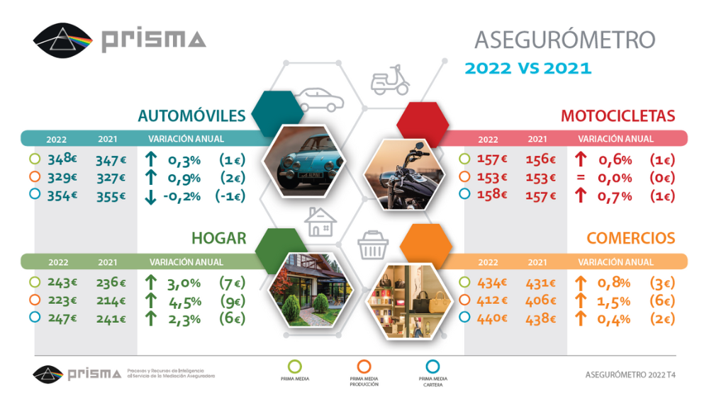 El observatorio PRISMA (Procesos y Recursos de Inteligencia al Servicio de la Mediación Aseguradora) acaba de dar a conocer los datos de su Asegurómetro correspondientes al 4º trimestre de 2022. De los 4 ramos analizados -Autos, Motos, Hogar y Comercio- el mayor incremento de precios en el canal corredores ha sido en Hogar cuyo precio medio se situó en los 242,69 euros, lo que supone un aumento del 3,03% (+ 7,14 euros) respecto a 2021. En nueva producción, el precio del seguro alcanza los 223,31 euros, 9,52 euros más que en 2021, una subida del 4,45%. Para la renovación de cartera, el precio a pagar por el seguro de Hogar apenas aumenta un 2,28%, siendo este para el cierre de 2022 de 246,79 euros.