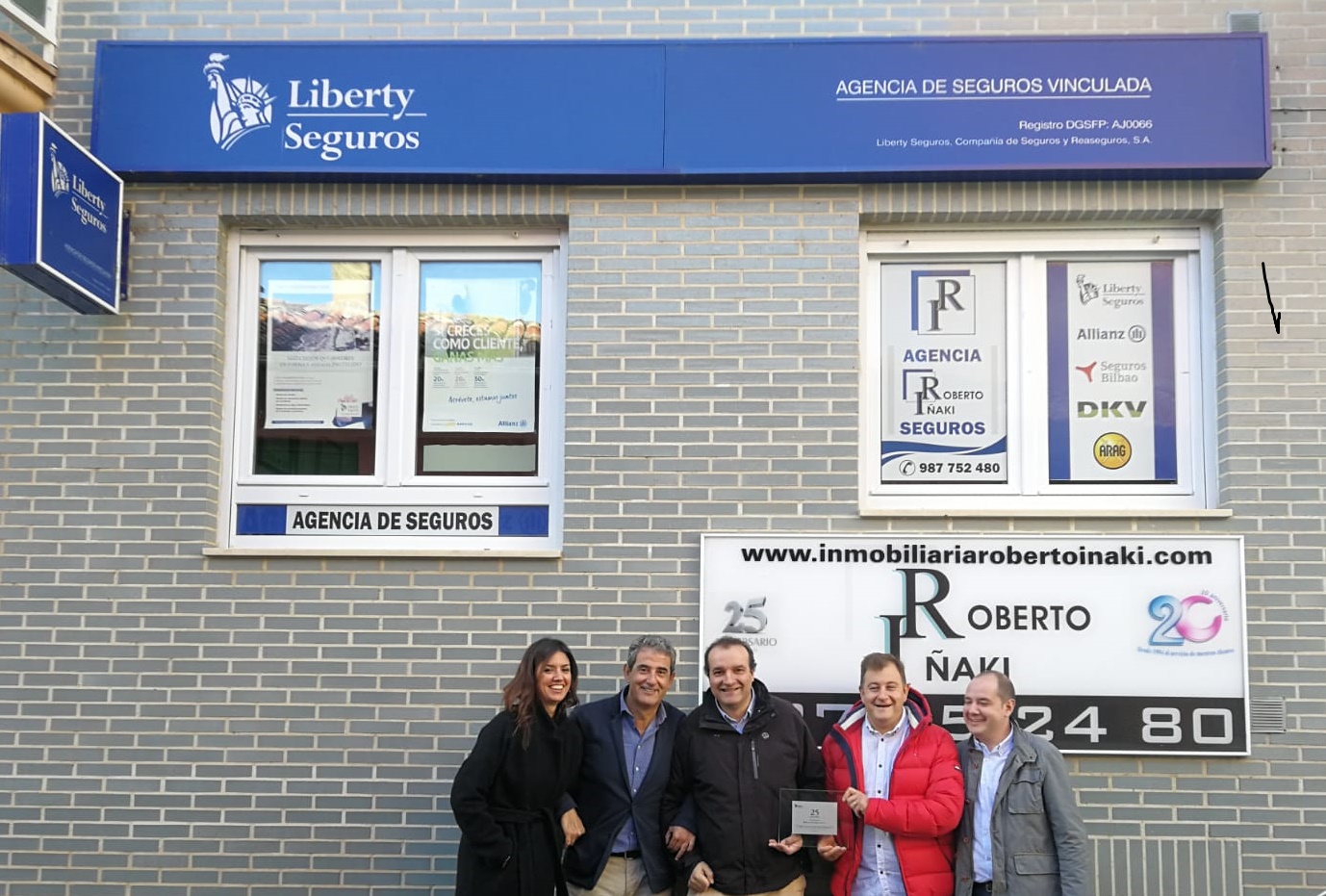 Liberty Seguros ha entregado un reconocimiento a la agencia Roberto & Iñaki 94 por su "compromiso con la aseguradora y por una labor destacable en materia de negocio y de satisfacción de los clientes". El 22 de octubre se han cumplido 25 años desde que Roberto & Iñaki 94 emitió su primera póliza de Liberty Seguros. El reconocimiento se realizó en la sede de la agencia en Valencia de Don Juan (León). Álvaro Iglesias, director de Distribución Tradicional de Liberty Seguros España, entregó el galardón, acompañado de Patricia Hernández, directora regional Centro y Pablo Rodríguez, director de Zona.