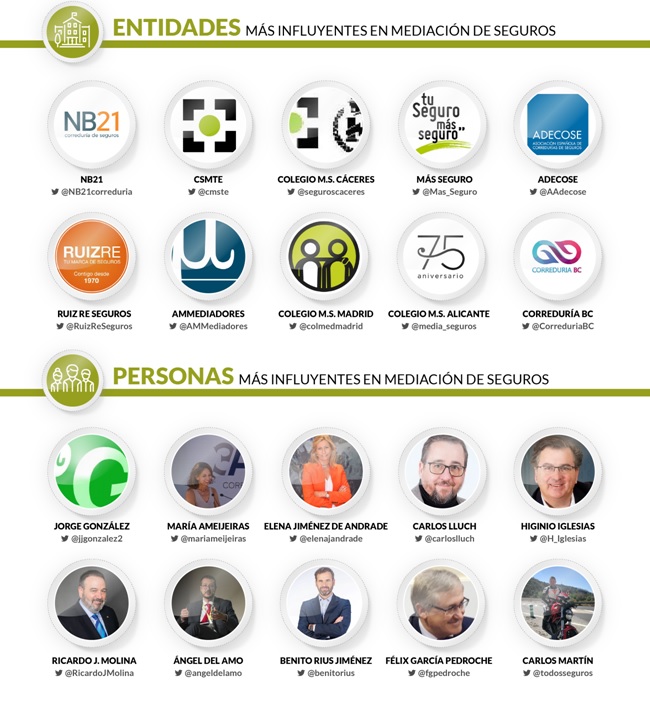 En el sector de mediación de seguros, los perfiles de entidades que destacan por encima del resto de cuentas en Twitter son @nb21correduria, @cmste, @seguroscaceres, @Mas_Seguro, @aadecose, @RuizReSeguros, @ammediadores, @colmedmadrid, @media_seguros, y @CorreduriaBC.