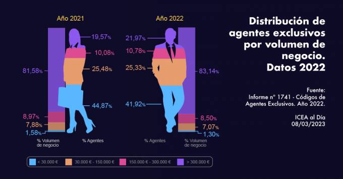 El 41,92% de los agentes exclusivos se posicionó en 2022 en la franja que menos primas intermedia, con menos de 30.000 euros anuales y aportó el 1,30% de las primas, según el estudio 'Códigos de Agentes Exclusivos. Estadística año 2022' de ICEA. El documento muestra la relación entre el número de agentes exclusivos, su aportación a la totalidad del negocio y el volumen de la cartera. En ese contexto, el colectivo de agentes con mayor actividad, con más de 300.000 euros de volumen de negocio, solo representan el 22% del conjunto de agentes exclusivos; aportaron al sector el 83% de las primas de negocio y en torno al millón de euros por agente.