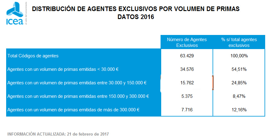 El sector asegurador cuenta con un total de 63.429 códigos de agentes exclusivos. De todos ellos, según datos de ICEA actualizados, el 54,5% distribuye un volumen de primas inferior a los 30.000 euros. Este porcentaje lo cubren 34.576 agentes exclusivos.
