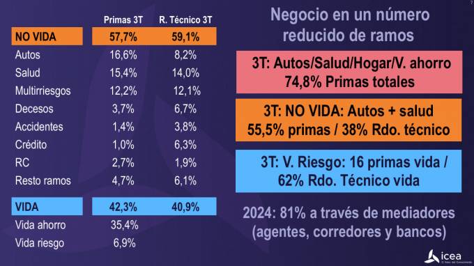 El director general de ICEA, José Antonio Sánchez, apuntó, con datos de 2024, que el 81% del volumen de primas del seguro se contratan a través de la mediación: agentes, corredores y operadores de bancaseguros. Señaló que las cifras hasta diciembre, con una mayor aportación de las primas en Vida (+23%), hacen prever que la composición entre canales variará en los datos de 2025 cuando se conozcan. Así, previsiblemente la distribución bancaria ganará cuota de mercado puesto que son los dominadores del ramo de Vida.