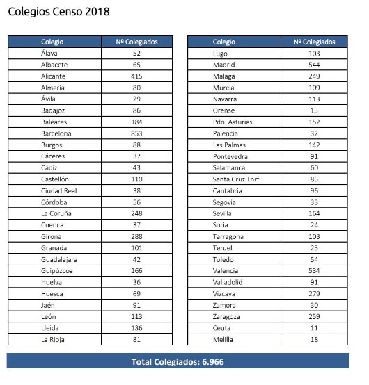 Por número de colegiados, el Colegio de Barcelona con 853 miembros es el que cuenta con más representatividad superando al resto de manera amplia. Le sigue el de Madrid con 544, Valencia con 534 y Alicante con 415.