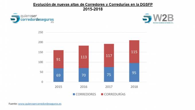 2018 arrojó un crecimiento en el número de corredores y corredurías en la DGSFP por cuarto año consecutivo. Según el informe elaborado por quierosercorredordeseguros.es el pasado año se cerró con un total de 210 nuevas altas -115 corredurías y 95 corredores individuales- con clave nacional, lo que supone un crecimiento del 10% respecto a las cifras del año anterior cuando se inscribieron en el registro 192.
