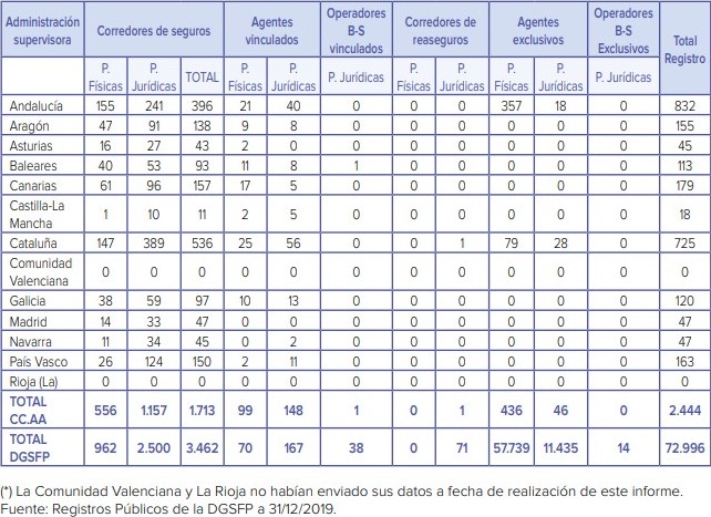 A los 72.996 mediadores inscritos en la DGSFP hay que añadir los 2.444 que aparecen en los registros autonómicos, volumen que ha descendido nada menos que un 6,7% en relación a 2018. No obstante, la DGSFP precisa en el informe que, como viene siendo habitual, no se han incluido los mediadores supervisados por la Comunidad Valenciana y La Rioja porque no han entregado sus datos a tiempo para la realización de esta estadística.