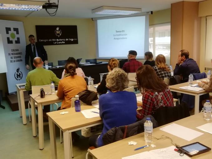 Dentro del programa del curso intensivo Grupo B, Fernando Grela Rumbo, gerente territorial comercial de Pelayo visitó el aula de formación del Colegio de la Coruña para impartir la clase presencial sobre 'La institución aseguradora, el coaseguro y el reaseguro'.