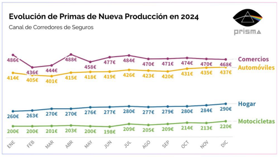Así, donde más ha subido la prima de nueva producción a lo largo de 2024 ha sido en Hogar. De enero a diciembre, se ha elevado un 11,5%, pasando de 260 euros a 290 euros. En renovación de cartera, el incremento ha sido también robusto, pero algo menor. En concreto, un 9,2%. En enero, la prima estaba en 284 euros y acabó el año en 310 euros. Y si se compara en términos interanuales por trimestres, igualmente el aumento es notable. En el cuarto trimestre de 2024, la prima media de Hogar se incrementó un 7,7% respecto al mismo trimestre del ejercicio anterior, terminando en 303 euros, 22 euros más. En nueva producción, la prima en Hogar creció un 8,4%, pasando de 263 euros en el último trimestre de 2023 a 285 euros de octubre a diciembre de 2024. Y en cartera, el canal corredores ha experimentado un aumento de la prima del 7,7% en el último trimestre del año recién concluido, ascendiendo a 307 euros, 22 euros más que en el cuarto trimestre de 2023.