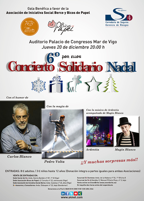 El tradicional concierto solidario de S4 dedicará, en su 6ª edición, su recaudación a las asociaciones Berce y Bicos de Papel. El evento, dirigido a todos los públicos pero en especial al infantil, contará con las actuaciones de Carlos Blanco, Pedro Volta Ilusionista y Ardentía junto a Magín Blanco.