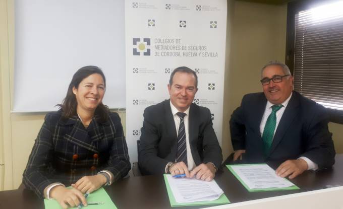 A la firma del acuerdo han asistido Miguel Peral, responsable comercial de la aseguradora en la Zona Sur; Elena Romero, presidenta del Colegio de Sevilla; y Javier García-Baquero, presidente del Colegio de Huelva.