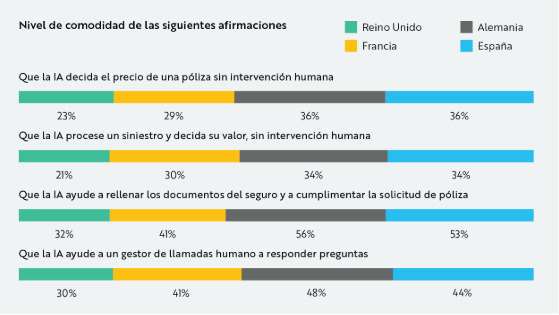 El 48% de los jóvenes españoles de entre 18 y 24 años se sentirían cómodos con el uso de IA por parte de las aseguradoras, mientras un 36% de los usuarios de todas las edades aceptarían el uso de IA para determinar los precios de las primas sin intervención humana. Eso sí, el 39% desearía poder contactar con una persona en caso de no estar de acuerdo con el chatbot, pese a ser una tecnología ya conocida y utilizada por casi 6 de cada 10 españoles. Son datos del estudio de Guidewire sobre la visión de los clientes de seguros en Europa en 2024, con más de 4.100 personas encuestadas en España, Francia, Alemania y Reino Unido.