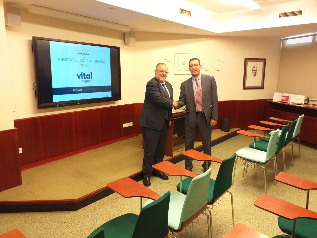 La firma corrió a cargo de Jordi Triola, presidente de la institución gerundense, y Ramon Puig, director comercial de Vital Seguro.