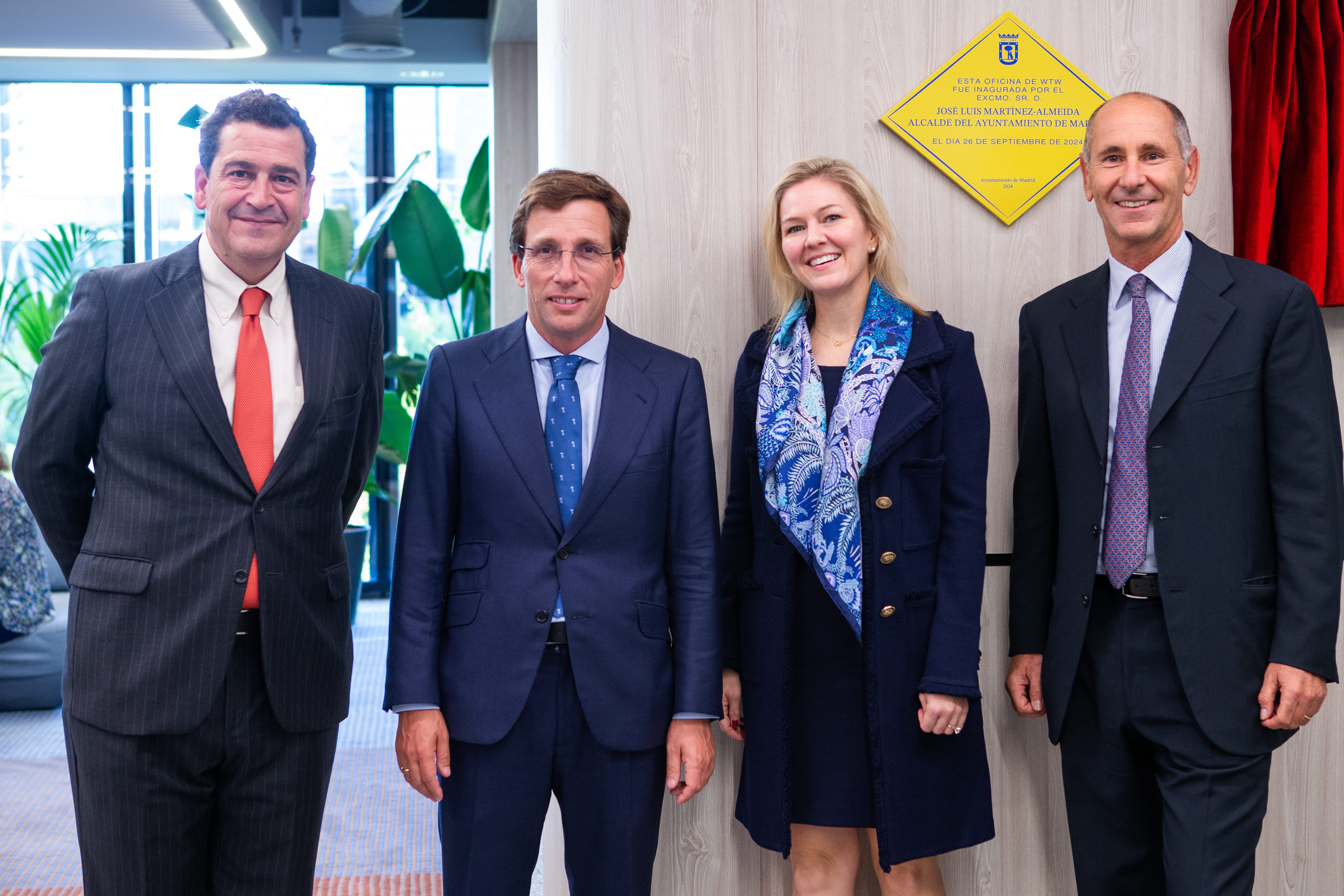 La nueva sede corporativa de WTW la ha inaugurado el alcalde de Madrid, José Luis Martínez-Almeida. También ha asistido una representación de empleados de las distintas unidades de la empresa, junto con miembros del equipo directivo nacional e internacional de WTW: Iván Sainz, director general de WTW España y presidente de Willis Iberia; Diego de la Torre, director de Administraciones Públicas y Sanidad para España; Anne Pullum, directora de Europa; Gianmarco Tosti, director de la región mediterránea; y Nicola Roos, directora de Real Estate en Europa.