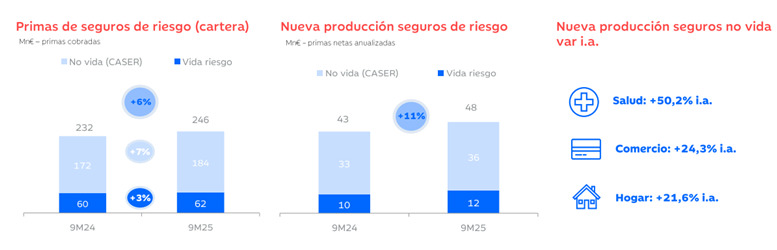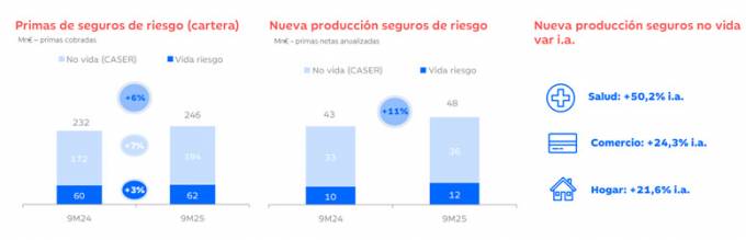 Además, apunta la compañía que la nueva producción de seguros de Vida Riesgo ha mostrado un crecimiento en primas del 11%, hasta los 48 millones. En general, estos seguros aumentan un 19,1% interanual. Respecto a No Vida, la nueva producción de Hogar crece un 21,6%, Comercio un 24,3% y Salud un 50,2%, con un "elevado dinamismo comercial" el seguro Caser Salud +60, concreta la entidad financiera. Menciona Ibercaja que la cartera de seguros de riesgo ha avanzado hasta los 246 millones, un 5,7% por encima de septiembre del pasado año, gracias a la rama No Vida que avanza un 7%.