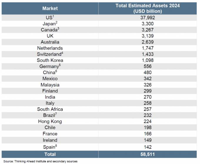 Si bien, existen diferencias significativas entre regiones: Estados Unidos sigue siendo, con diferencia, el mayor mercado de pensiones, con un 65% del total de los activos globales: seguido de Japón y Canadá, con un 5,7 y un 6%, respectivamente. El primer país europeo es Reino Unido, en cuarta posición, al concentra un 3% de los activos. Estos cuatro países representan el 82% de todos los activos de pensiones a nivel mundial.