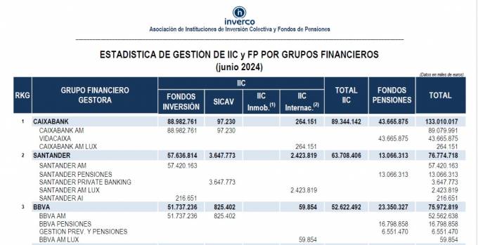 La banca vuelve a ocupar un trimestre más el podio del ranking realizado por Inverco de IIC y Fondos de Pensiones. CaixaBank sigue en primera posición e incrementa su patrimonio hasta los 133.010 millones de euros, casi 3.000 millones más respecto al trimestre anterior. En lo que se refiere a Fondos de Pensiones no tiene competencia y alcanza los 43.665 millones de euros.