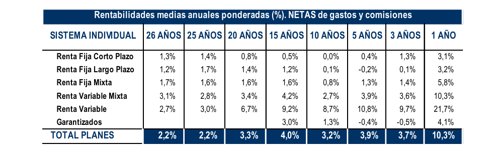 La rentabilidad a 1 año se situó en el 10,3%, con rendimientos en la categoría de Renta Variable del 21,7%. Mientras, a 20 años cerró en el 3,3%, a 10 años en el 3,2% y a 15 años en el 4%.