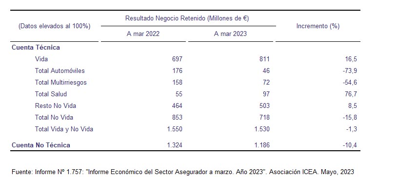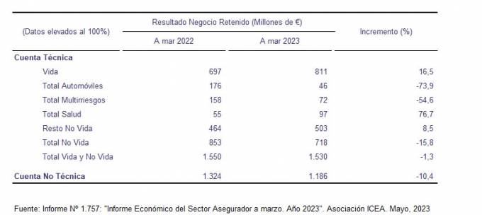 El beneficio del sector asegurador se ha contraído en este primer trimestre del año. Los datos de ICEA que se hicieron ayer públicos muestran un resultado de la cuenta no técnica de 1.186 millones de euros frente a los 1.324 de un año antes. Esto indica que en este 2023 el resultado del total del sector se ha reducido en un 10,4% por una diferencia de 138 millones.