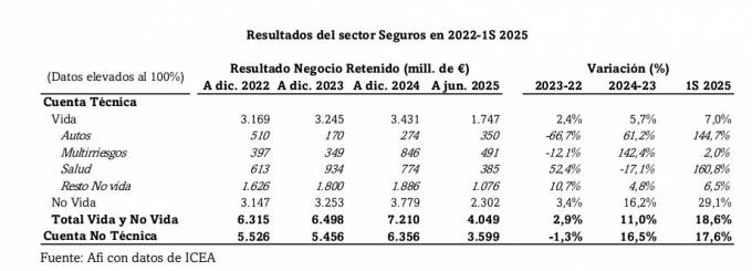 Subraya también que la cuenta técnica alcanzó los 4.049 millones, lo que muestra un crecimiento del 18,6% respecto al mismo periodo del año anterior. Vida ha mejorado un 29,1%, mientras No Vida lo hace un 7%. Por su parte, la cuenta no técnica creció un 17,6% situándose en 3.599 millones, "lo que anticipa un ejercicio con resultados agregados que previsiblemente perforarán los máximos históricos".