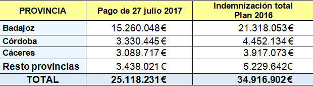 Agroseguro ha comenzado a pagar las indemnizaciones de los siniestros por pérdida de pastos ocurridos en el primer semestre de 2017, especialmente en los periodos con bajo índice de vegetación. En total, abonará 25,1 millones, de los cuales 18,3 millones se entregarán a asegurados extremeños y 4,1 millones, a clientes andaluces.