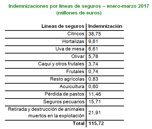 Agroseguro ha pagado en el primer trimestre del año un total de 115,72 millones de euros en indemnizaciones a agricultores y ganaderos con seguro agrario. Esta cantidad