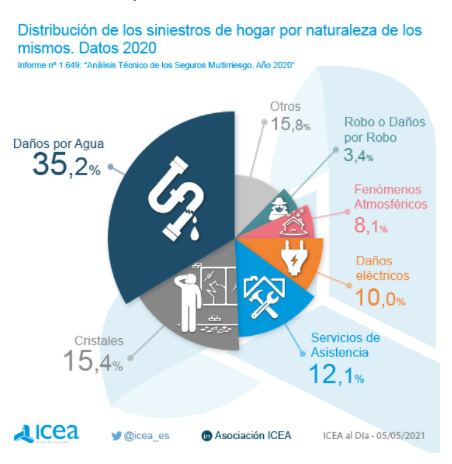 Los daños por agua fueron la causa principal del 35,2% de los siniestros en el ramo de Hogar a los que tuvieron que hacer frente las compañías de seguros en 2020. En cuanto al número, el 15,4% fueron cristales, servicios de asistencia 12% y los daños eléctricos el 10%.
