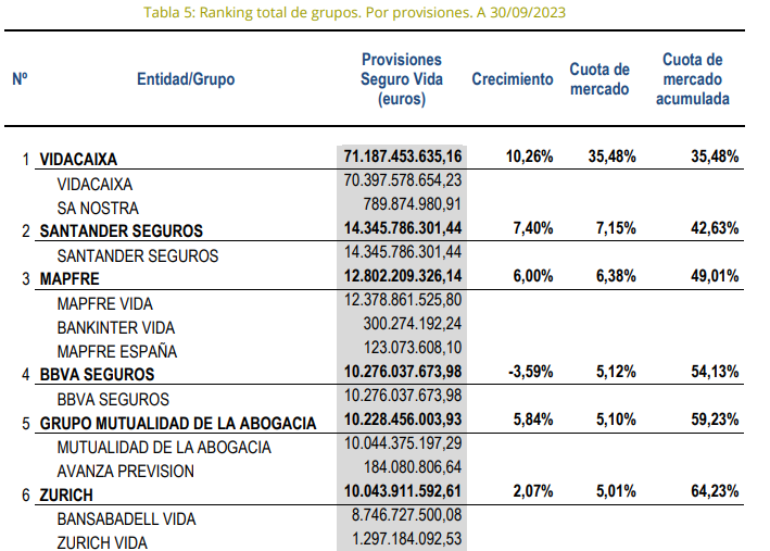 El ranking de grupos por provisiones en el seguro de Vida lo sigue liderando VidaCaixa, que cierra el tercer trimestre con 71.187 millones (+10,2% y una cuota de mercado del 35,5%). Y el podio lo completan Santander Seguros (14.345 millones y +7,4%) y Mapfre (12.802 millones y 6%).