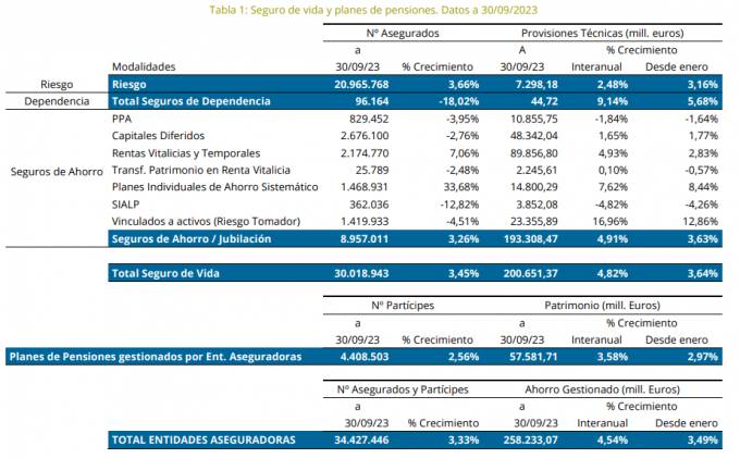En términos generales, este buen dato del ahorro gestionado va acompañado por un crecimiento en el número de partícipes y asegurados. En total, ya se superan los 34,4 millones, un 3,3% más que en septiembre de 2022. De los 34,4 millones, el conjunto del seguro de Vida aporta más de 30 millones después de ganar un 3,4% más de clientes en el último año. Tanto Vida Ahorro (+3,3% y casi 9 millones de asegurados) y como Vida Riesgo (+3,6% y casi 21 millones de asegurados) han contribuido a ampliar la cartera. Si bien, en Vida Ahorro no todas las modalidades se han comportado igual. De hecho, solo dos han ganado clientes hasta septiembre: PIAS (+33,7%) y Rentas Vitalicias (+7%). El resto han visto cómo menguaba su cartera, especialmente los Sialp (-12,8%). Terminando con los seguros, el negocio de Dependencia sigue sin atraer clientes y en el último año ha perdido a un 18%.