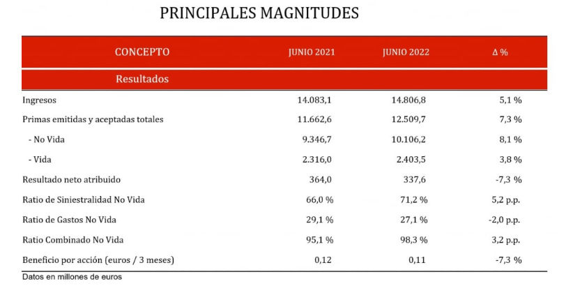 Los datos del grupo muestran un ratio de siniestralidad No Vida que ha crecido en 5,2 puntos porcentuales entre el pasado junio y el de 2021 hasta situarse en el 71,2%.