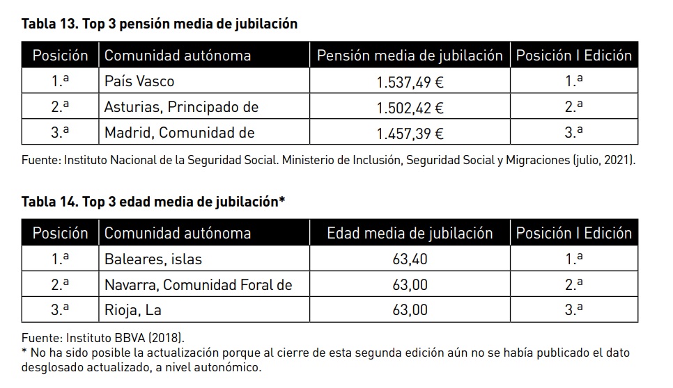 El informe señala que el País Vasco, seguida de Castilla y León y Navarra son las 3 comunidades autónomas que mejores servicios ofrecen para el colectivo senior y pone de manifiesto que no todas las comunidades autónomas ofrecen las mismas condiciones y oportunidades a las personas mayores de 55 años en términos de empleo, acceso a servicios sociales y sanitarios y número de residencias y centros de día, entre otros. Revela, además, que también existen diferencias con respecto a otros indicadores, como la esperanza de vida, la edad media de jubilación, importe medio de la pensión y número de alcaldes y electores mayores de 55 años.