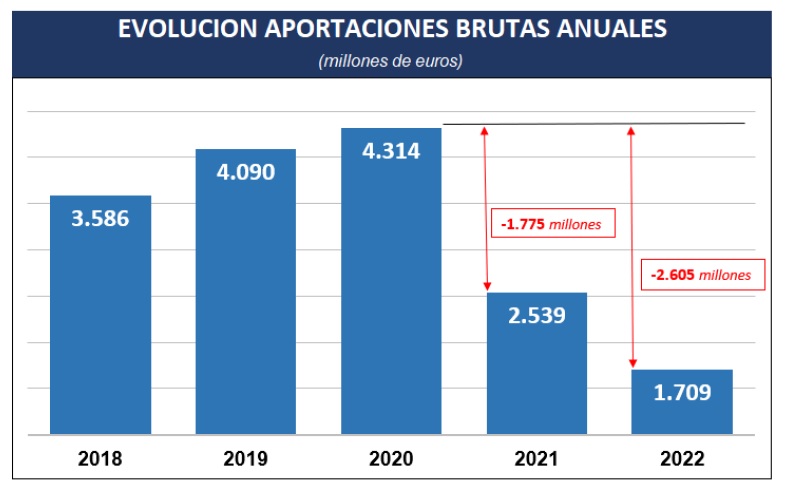 La inmediata consecuencia de la nueva reducción del límite de aportación a Planes Individuales a 1.500 euros anuales ha sido una caída en las aportaciones del 32% en 2022 que se situaron en 1.709 millones de euros. En tan solo dos años las aportaciones han descendido 4.380 millones de euros en el ahorro para la jubilación de los españoles, según datos facilitados por Inverco.