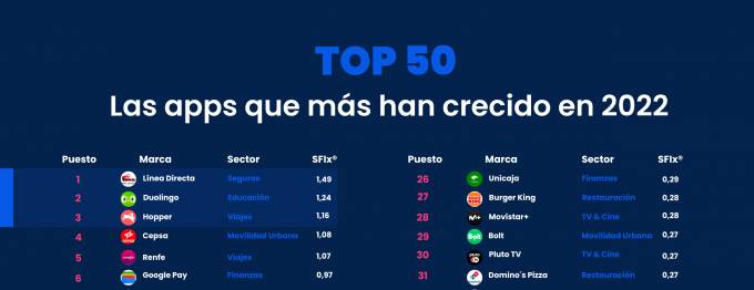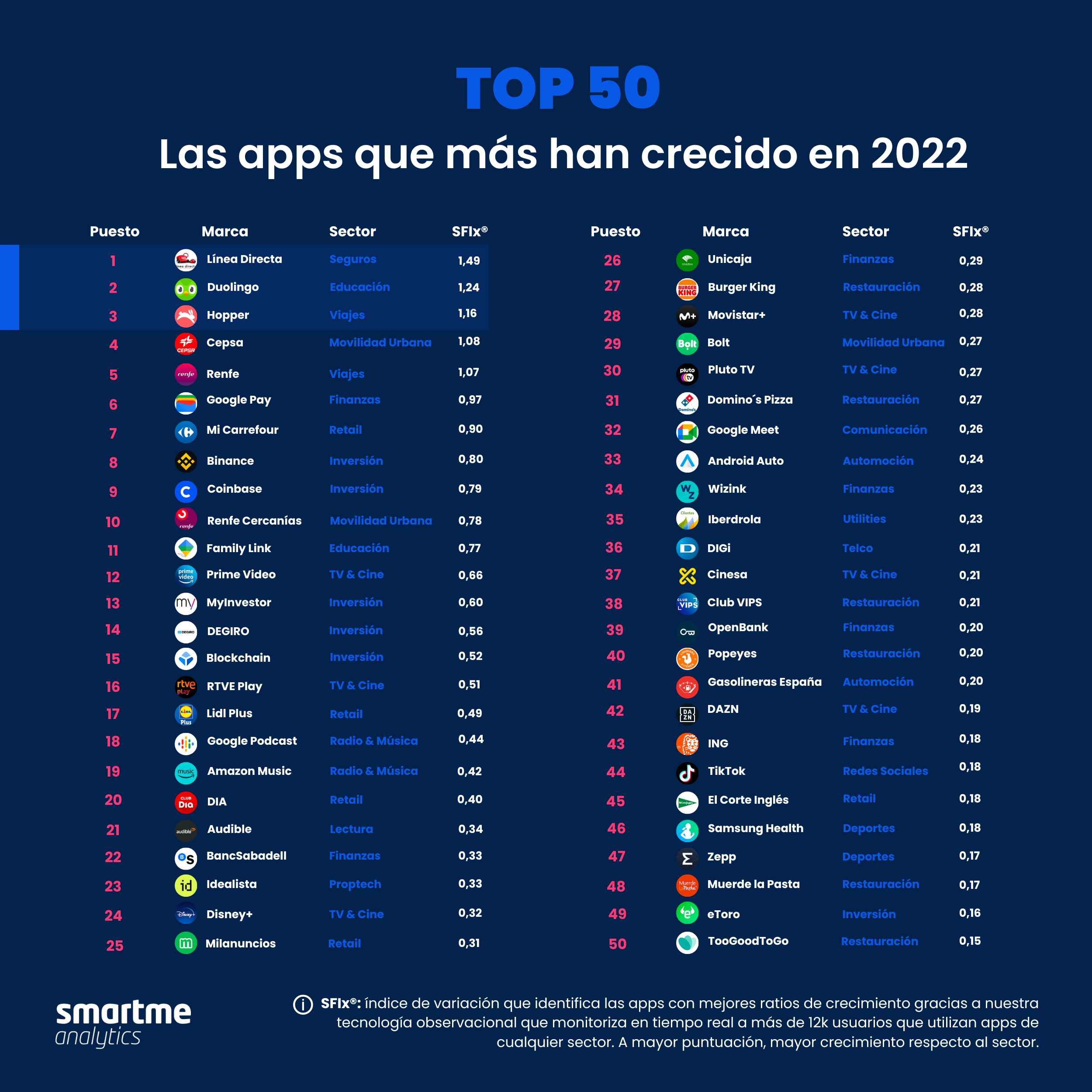 La app de Línea Directa es la aplicación móvil que más ha crecido en cuanto a descargas y uso en 2022, según el índice SFIx® que elabora Smartme Analytics, compañía de tecnología y data observacional. El podio lo completan la app de Duolingo, empresa de formación en idiomas, y la de Hopper, agencia de viajes digital.