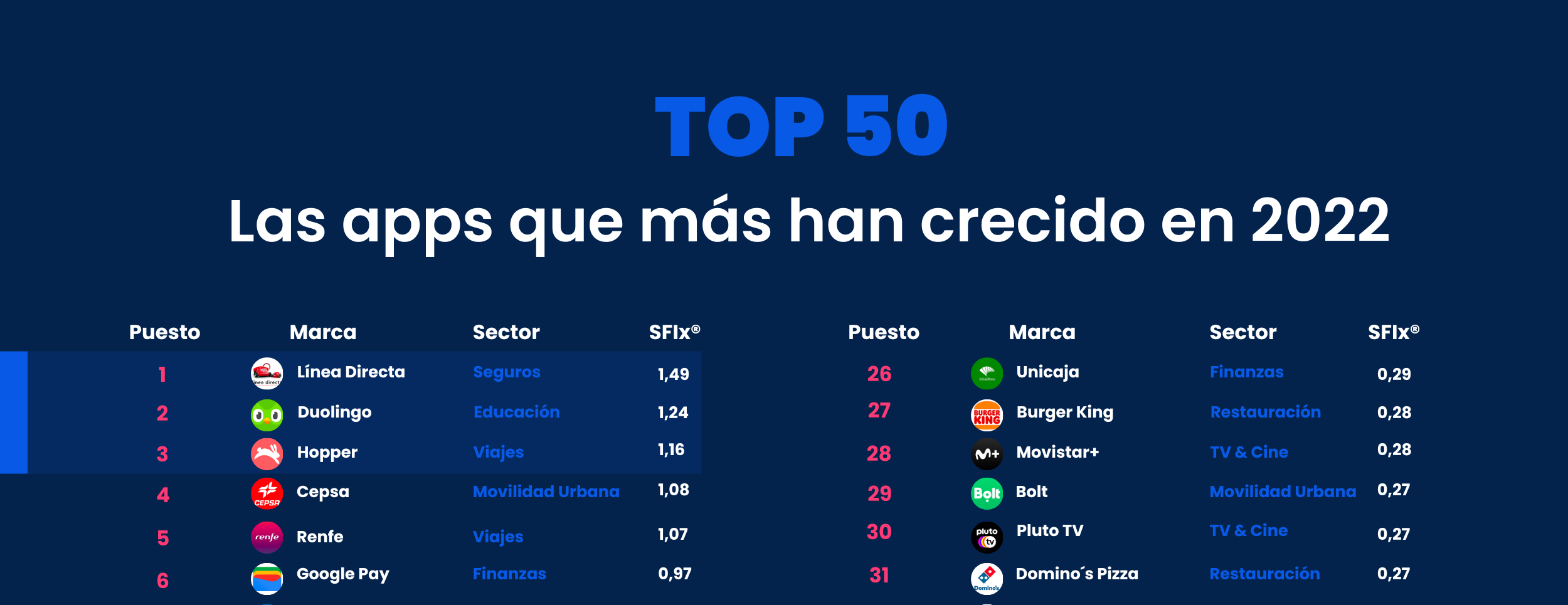El SFIx® es un índice de variación que muestra qué aplicaciones han crecido y decrecido más en los principales sectores del canal móvil. En su cálculo, se tiene en cuenta el crecimiento del propio sector, así como la penetración de cada app. El resultado da una puntuación que no tiene un baremo límite. Cuanto mayor es la puntuación, más crece la app con respecto al sector.